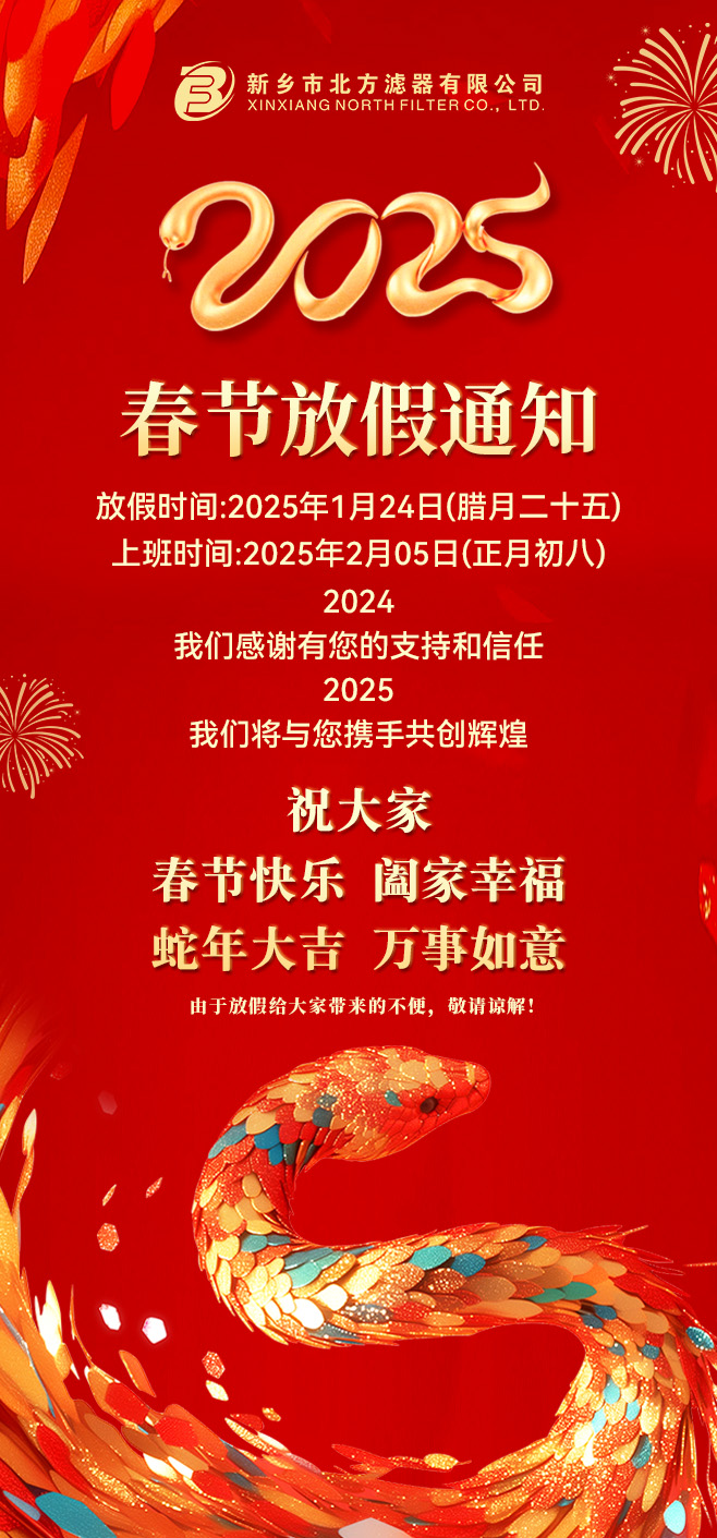 新鄉市北方濾器有限公司2025年春節放假時間為2025年1月24日起至2025年2月25日,共計12天。在這期間,工廠將暫停生產,業務部保持正常服務接單。正常生產將于2025年2月5日(大年初八)恢復。